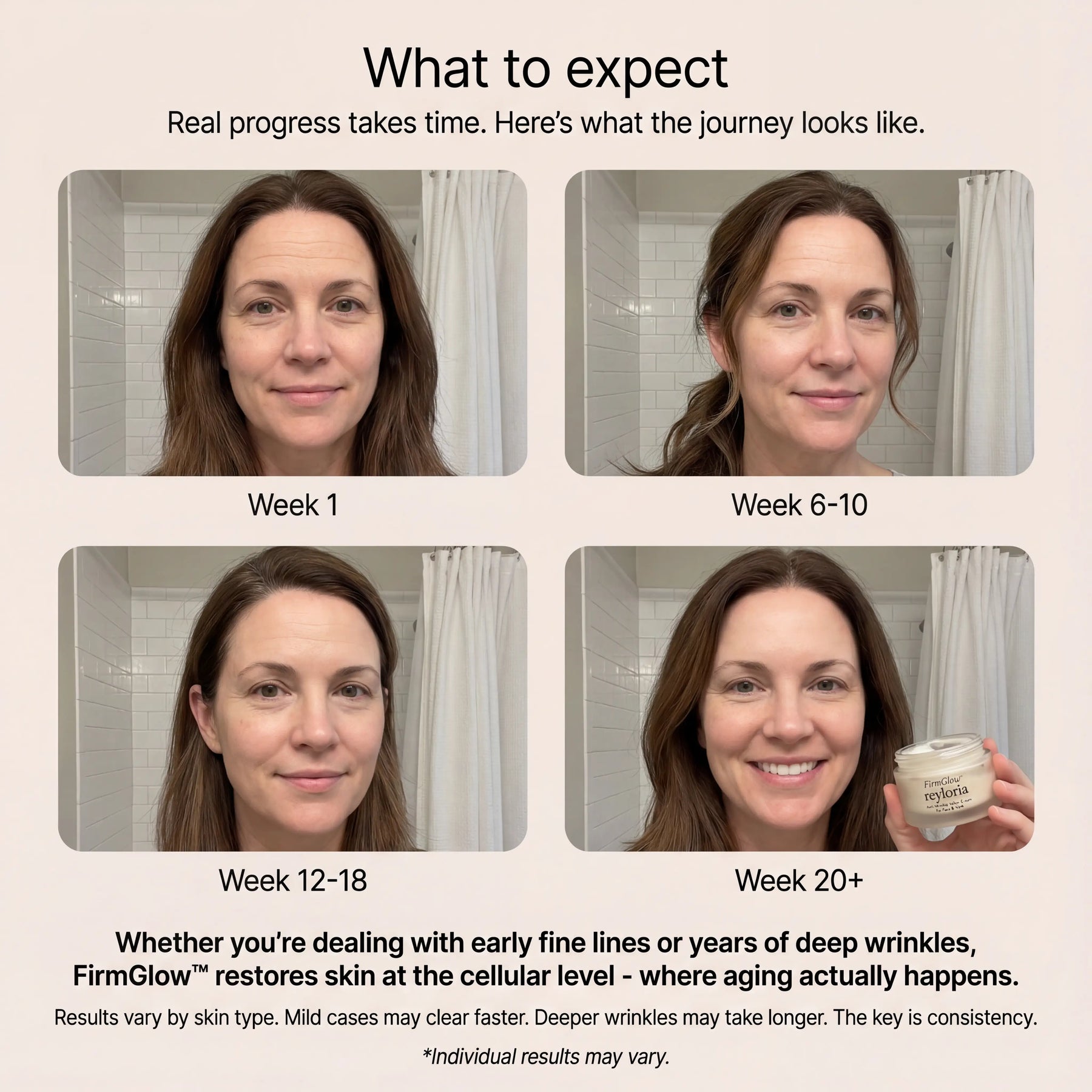 By week 12, most women see real transformation – firmer skin, fewer fine lines, restored volume. If your skin has been neglected for years, it may take longer. You're rebuilding what took decades to break down.